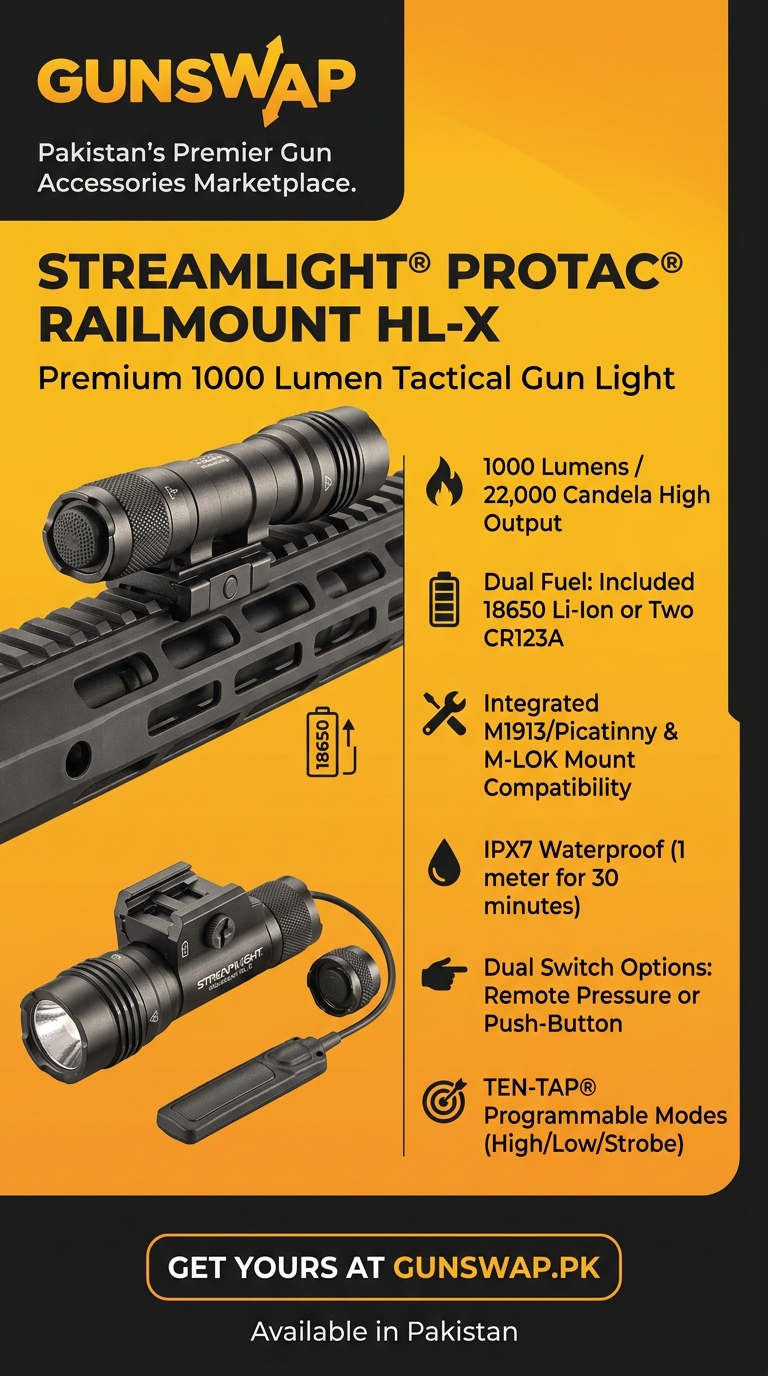 The Streamlight ProTac HL-X is ideal for security professionals and responsible firearm owners looking for a premium tactical gun light in Pakistan. Order online for authentic quality, competitive price, and free delivery across Pakistan.
